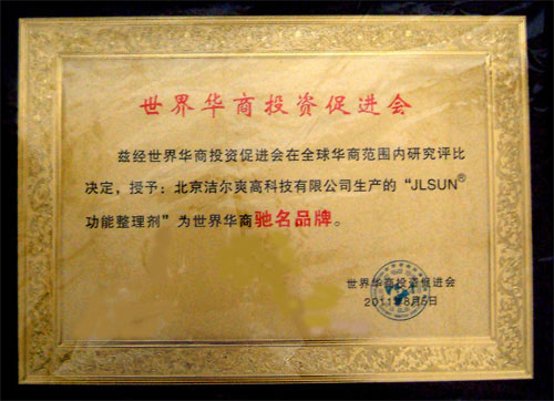 世界華商促進會授予“JLSUN功能整理劑”為世界華商馳名品牌